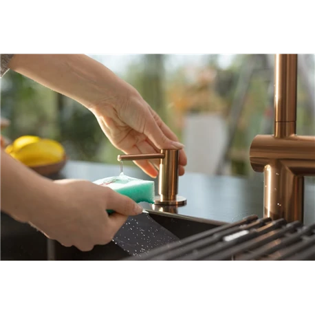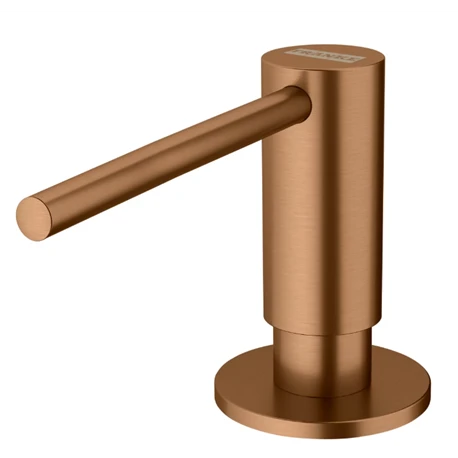 Distributeur de savon Atlas référence 886963 Cuivre de Franke, tout inox, bec rotatif à 360°, embase ∅50 mm, perçage ∅24-35 mm, capacité 350 ml, remplissage par la tête du distributeur. Concernant le traitement de surface de grande qualité, il confère une résistance et une durée de vie accrues au mitigeur. Cette technologie rend les mitigeurs de couleur résistants à l’usure, aux produits chimiques, à la corrosion et aux rayures. Code EAN: 7612985886963. Code FUN: 112.0625.486. Les coloris du distributeur de savon Atlas sont compatibles avec les mitigeurs de la gamme Atlas et Eos Neo.