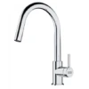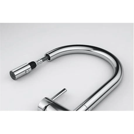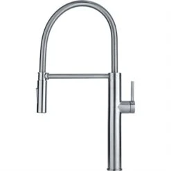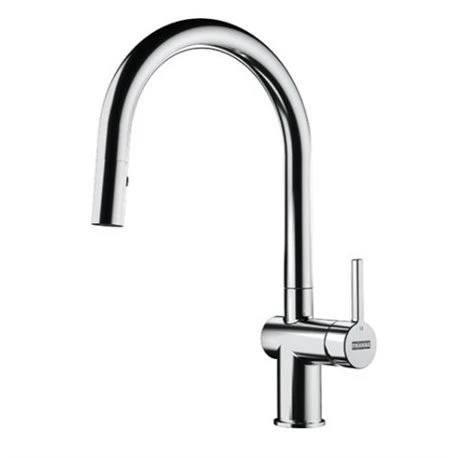 Mitigeur cuisine Active J à douchette coloris Chromé ref 056563 de Franke, rotation du bec sur 180°, levier de commande 0/100°, débit 7,5 L/min. Hauteur 388 mm. Douchette en laiton, flexible de douchette tressé et cartouche éco utilisant jusqu’à 50% d’eau en moins. Code FUN: 115.0653.401. Code EAN: 7612986056563