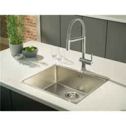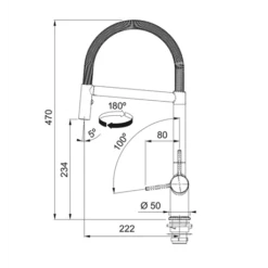 Mitigeur de cuisine Active Semi Pro à douchette double jet de Franke, ref 056624, coloris chrome. Rotation du bec sur 180°. Cartouche ø 35 mm. Débit : 7,5 ltr / min. Embase ø 50 mm. Perçage ø 35 mm. Levier de commande 0°/ +100°. Débit 7,5 L/min (3 bars). Support de douchette aimanté. Système de fixation avec corps fileté. Cartouche ECO. Ecoulement laminaire. Code EAN: 7612986056624, code FUN: 115.0653.407