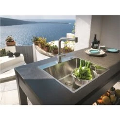 Mitigeur cuisine à douchette double jet de Franke, Atlas neo tout inox ref 444934 coloris inox. Rotation du bec sur 180°. Embase Þ 45 mm. Perçage Þ 35 mm. Levier de commande -6°/ +90°; Débit 9,7 L/min (3 bars). Flexible de douchette tressé. SystÚme de fixation avec corps fileté. Idéal pour adapter la force du jet en fonction des besoins : rincer la vaisselle avec un jet fort, utiliser un jet plus doux pour laver les fruits et légumes. Douchette extractible pour une amplitude de mouvement renforcée, parfait pour atteindre les coins de la cuve. Code EAN: 7612985444934, code FUN: 115.0521.441