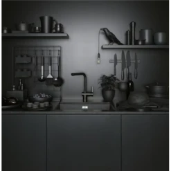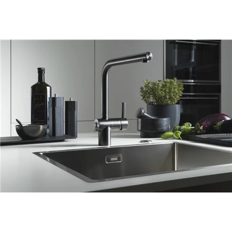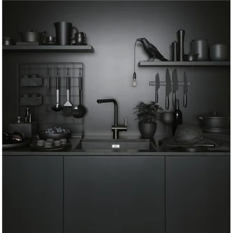 Mitigeur cuisine Atlas Neo Sensor ref 886888 Inox noir, à bec de Franke, système de mise en marche sans contact (avec capteurs infrarouges). Rotation du bec sur 180°. Embase ø 45 mm. Perçage ø 35 mm. Levier de commande : -6°/ +90° . Débit : 12,2 ltr / min. (3bars). Ecoulement laminaire. Système de fixation avec corps fileté. Code FUN: 115.0625.525. Code EAN: 7612985886888