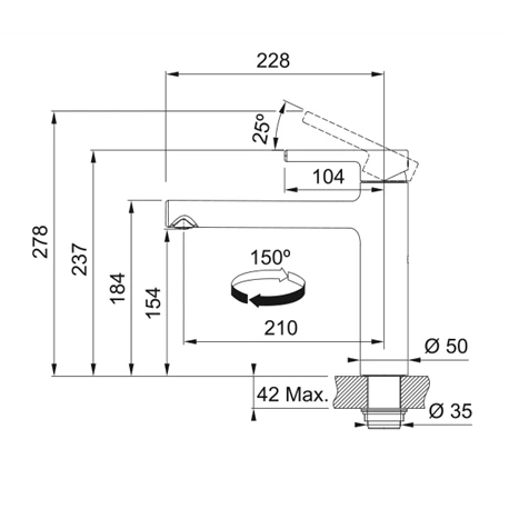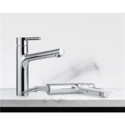 Mitigeur cuisine Centro solution fenêtre de Franke, coloris chrome, escamotable à douchette monojet, ref 767095. Rotation du bec sur 120°. Embase ø 50 mm. Perçage ø 35 mm. Levier de commande -45°/+45°. Débit 9,7 L/min (3 bars). Cartouche ø 35 mm. Système de fixation à corps fileté. Cartouche Eco. Ecoulement laminaire. Code EAN: 7612985767095, code FUN: 115.0600.138