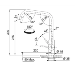 Mitigeur cuisine Ă bec Kubus rĂ©f 474702 de Franke, inox, rotation du bec sur 360°, embase Ă50 mm, perçage Ă35 mm, levier de commande -6°/90°, dĂ©bit 12,7 L/min, hauteur 330 mm, code EAN: 7612985474702. Code FUN: 115.0529.202.