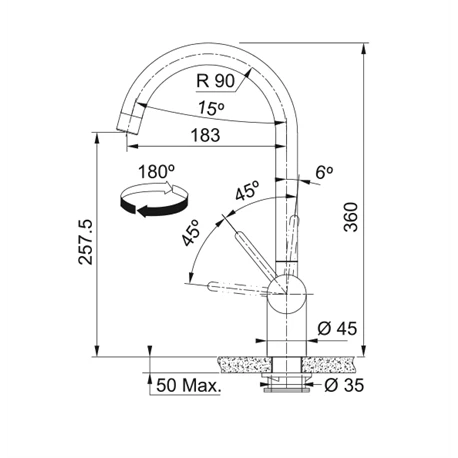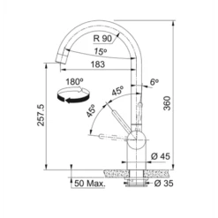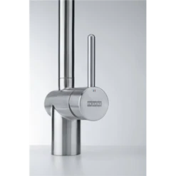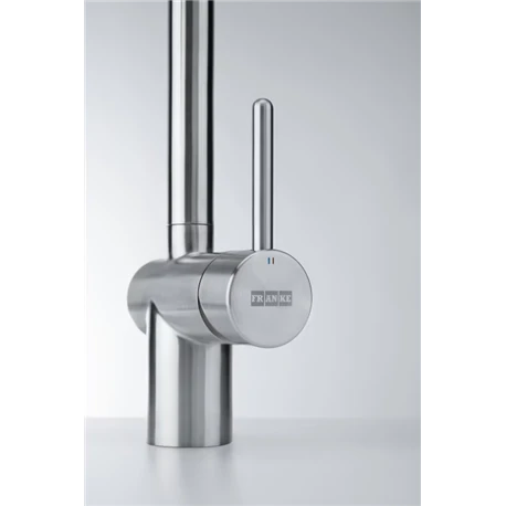 Mitigeur cuisine à bec Leda Neo tout inox de Franke, ref 728805. Rotation du bec sur 180°. Embase ø 45 mm. Perçage ø 35 mm. Levier de commande : 0°/ 90°. Débit 12,8 L/min (3 bars). Cartouche ø 35 mm. Ecoulement laminaire. Système de fixation avec corps fileté. Code EAN: 7612985728805, code FUN: 115.0590.046