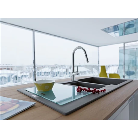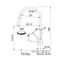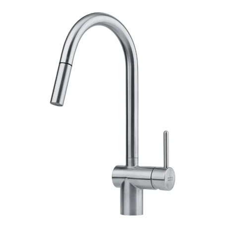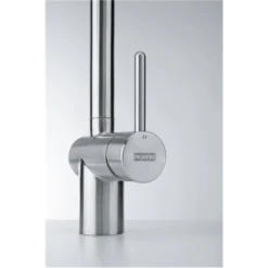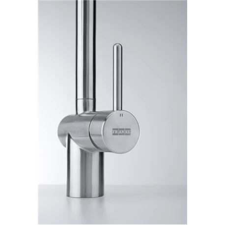 Mitigeur cuisine à douchette monojet Leda Neo tout inox de Franke, ref 728812. Rotation du bec sur 180°. Embase ø 45 mm. Perçage ø 35 mm. Levier de commande : 0°/ 90°. Débit 10,4 L/min (3 bars). Cartouche ø 35 mm. Ecoulement laminaire. Système de fixation avec corps fileté. Code EAN: 7612985728812, code FUN: 115.0590.047
