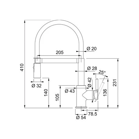 Mitigeur cuisine Lina Semi-Pro Chromé/noir mat ref 901819 de Franke, douchette double jets, rotation du bec sur 150°, levier de commande 0/90°, débit 9 L/min. Hauteur 410 mm. Code FUN: 120.0626.085. Code EAN: 7612985901819