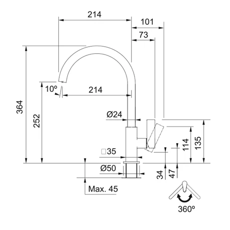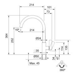 Mitigeur cuisine Ă bec Maris Neo de Franke rĂ©f 451260 coloris chrome, rotation du bec Ă 360°, levier de commande 0°/90°, embase Ă45 mm, perçage Ă35 mm, dĂ©bit 10 L/min, hauteur 364 mm, code EAN: 7612985451260. Code FUN: 115.0523.193.