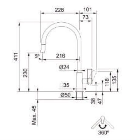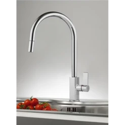 Mitigeur cuisine à douchette monojet extractible Maris Neo de Franke réf 451284 coloris chrome, flexible de douchette tresse, rotation du bec à 360°, levier de commande 0°/90°, embase Ø45 mm, perçage Ø35 mm, débit 8,1 L/min, hauteur 411 mm, code EAN: 7612985451284. Code FUN: 115.0523.195.