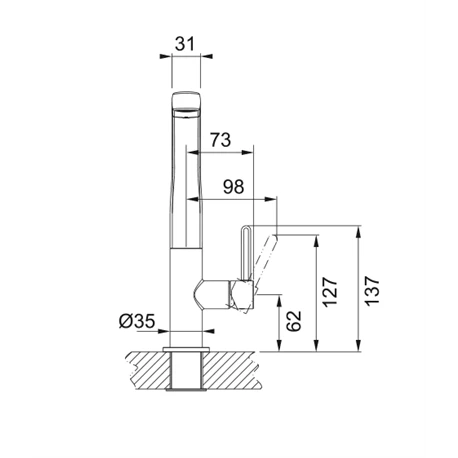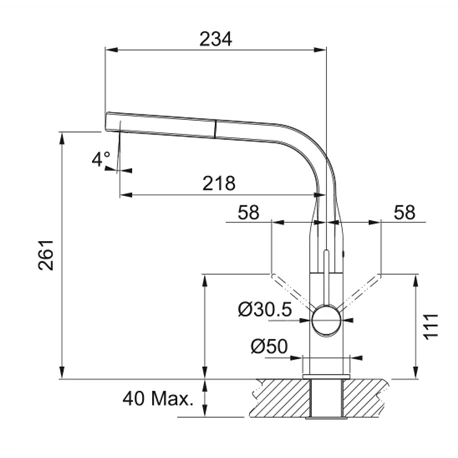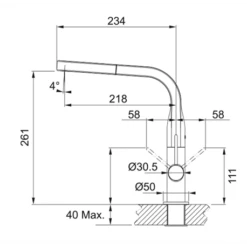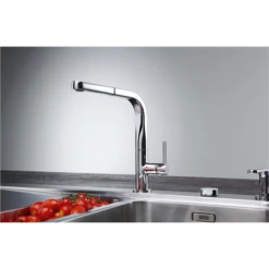 Mitigeur cuisine Sinos à douchette monojet coloris chrome de Franke, ref 918317. Rotation du bec sur 360°. Embase ø 50 mm. Perçage ø 35 mm. Levier de commande +45°/-45°. Débit: 8,8 L/min (3 bars). Flexible de douche tressé. Code FUN: 115.0259.975, code EAN: 7612980918317